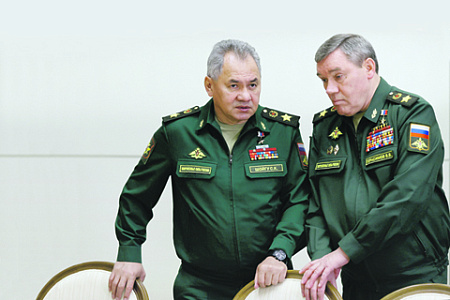 Министр обороны Сергей Шойгу и начальник Генерального штаба Валерий Герасимов перед началом совещания с президентом в Сочи. Фото РИА Новости